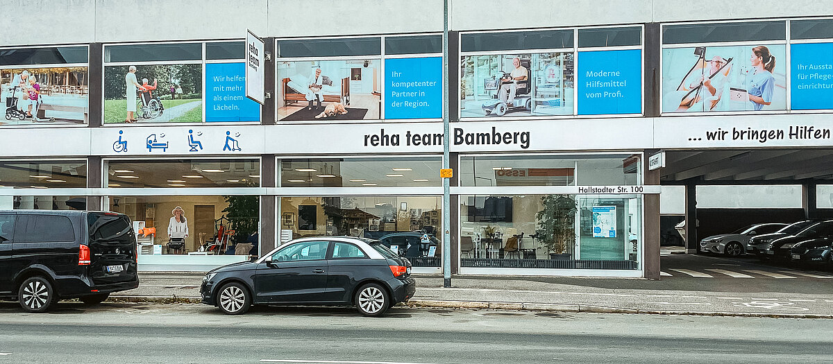 Willkommen beim reha team in Bamberg! Auf rund 300qm beraten wir Sie ausführlich zu Mobilitätshilfen wie z.B. Rollator oder E-Scootern, Kinder- und Alltagshilfen. Sie finden uns im Gewerbegebiet Hallstadter Straße – gegenüber der Tankstelle, beim Autohaus Kowalski. Wir haben Parkplätze direkt vor der Tür; wenn Sie mit dem Bus kommen möchten ist Ihre Haltestelle "Am Zollhaus", von dort aus sind es etwa 50m zu uns.